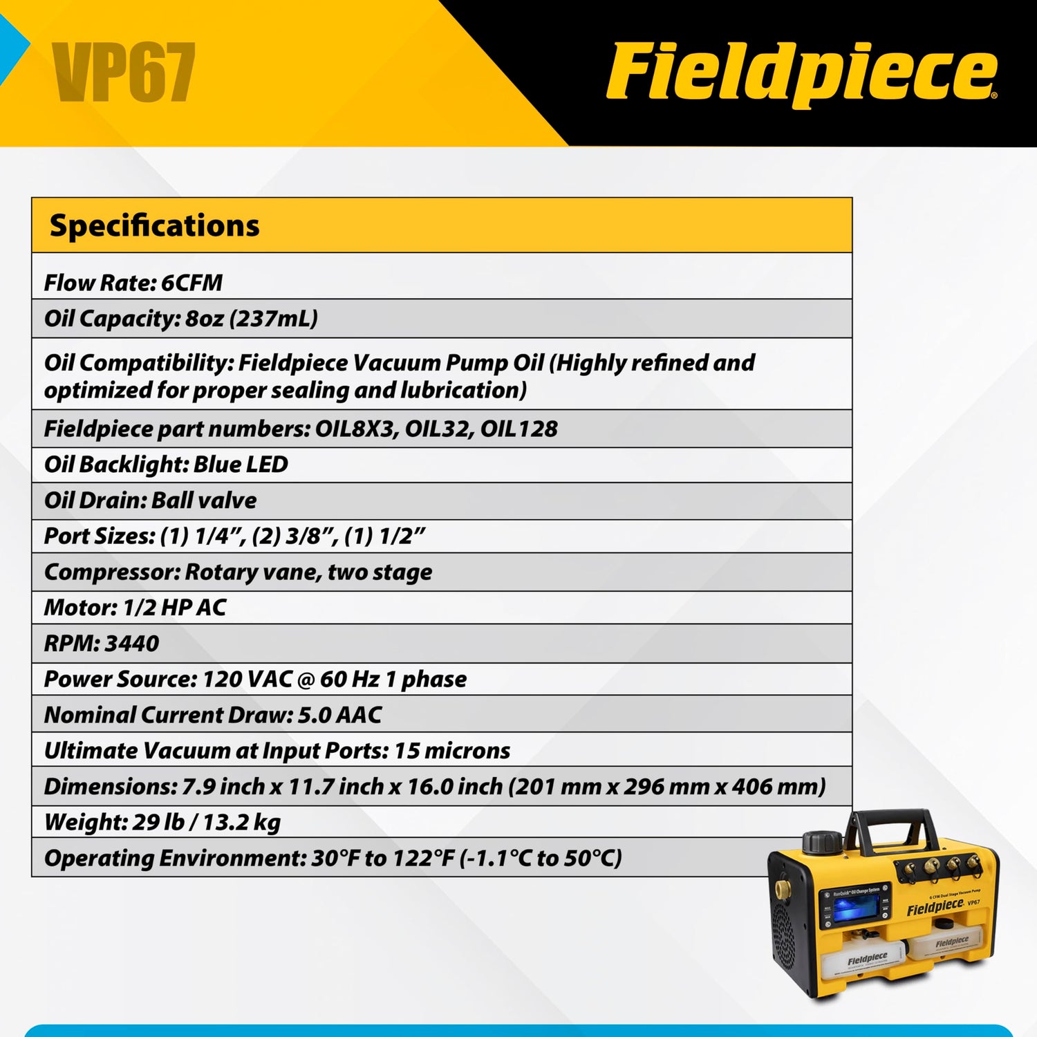 Fieldpiece VP67 Vacuum Pump – 6 CFM, 1/2 HP DC Motor, RunQuick Oil Change System – Portable - Professional HVAC Tool - A2L Compatible